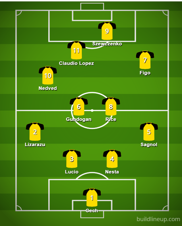Panowie, po pierwsze chcialem podziekować za wyrozumiałość, sporo ostatnio w moim zyciu prywatnym sie dzieje (zupelnie nietypowo jak na okres styczniowy, poswiateczny) i tak na prawde fizycznie nie bylo kiedy cos skrabnać do tej pory. Ponizej wrzucam druzynkę. Jak widac na zalaczonym obrazku bede grał bardzo mocno swego czasu popularne ustawienie 4-4-2 z czworka obronców linii, dwoch srodkowych pomocnikow bez wyraznego podzialu na ofensywnego dyrygenta i defensywnego przecinaka, idac raczej w nowoczesny styl zawodnikow multipozycyjnych, gdyz tandem Rice-Gundogan to w wybranych przeze mnie czasach zawodnicy o charaterystye najblizszej pozycji numer 8, ale tak na prawde z mozliwoscia gry na 6 (przede wszystkim Rice) oraz 10 (magik Gundogan). Skrzydla oraz atak to zawodnicy, którzy swoj prime maja na przelomie wieków, wiec co czesto moe byc pomijane w sposob naturalny powinni sie ze soba dobrze czuc (jak smiesznie by nie to nie zabrzmiało). Zeby nikt nie miał do mnie pretensji, ze cos probuje ukryc w sprawie ich dokonan druzynowych w trakci kampanii w ktorych ich wybrałem, to tylko napisze, ze Nedved oraz Figo pauzowali w kluczowych meczach przez kartki (Figo w pierwszym polfinale przegranym 4-1, natomiast nasz przyjaciel z południa w pamietnym finale - casus Ballacka z WC 2002). Po tych wydrzeniach fifa/uefa zmienila sposob rozliczania kartek w fazie pucharowej. Natomiast duet naastnikow Claudio Lopez- mlody Andrij Szewczenko w drodze do finalu/polfinalu ligi mistrzow rozbili odpowiednio po drodze napakowanych talentem, kasa Lazio Rzym oraz niespelniona Barcelone (z zawieszonym, nomen omen- Luisem Figo w pierwszym polfinale) w przypadku Wszy z Argentyny. Jesli chodzi o Dynamo i ich kolejny epicki sezon w Lidze Mistrzów to cwiercfinal z Realem Madryt (zwyciesca Ligi Mistrzów z poprzedniego sezonu) oraz fantastyczny boj z Bayernem Monachium w polfinale na zawsze zostana w pamieci kibców. Nie bede tutal oczywiscie przypominal kto byl najwiekszym aktorem tych legendarnych pojedynkow z najwiekszymi klubami Europy tamtego okresu. W trakcie dnia wrzuce jeszcze po kilka zdan na temat gry, ale chciałem cokolwiek napisac, by nie ograniczyc posta do tabelki ze skladem... - Dzisiaj