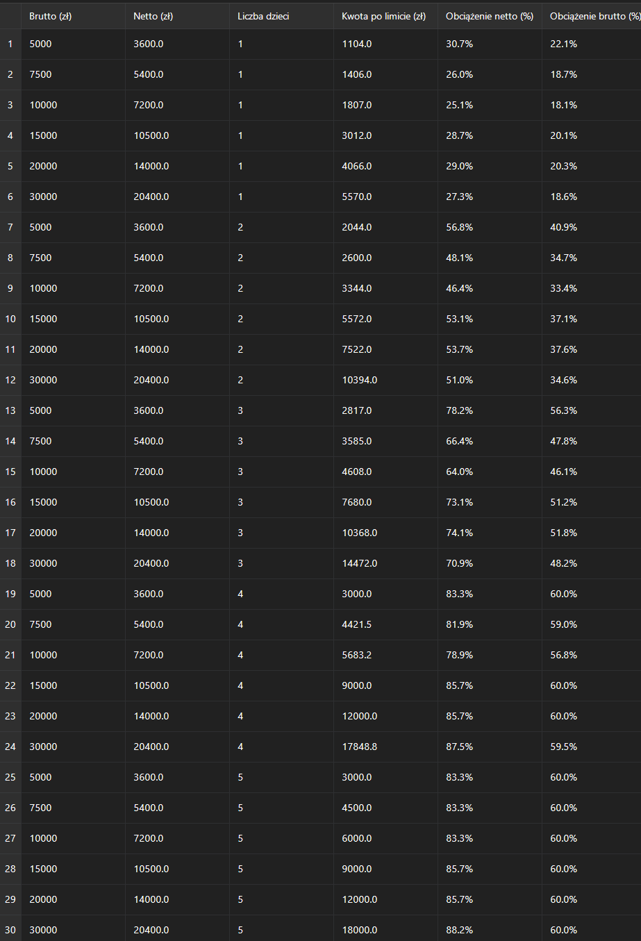 obciązenie brutto sie zgadza 60% xD. Przykład z trójką dzieci przy 5k brutto i zostaje na przezycie 783 zł netto. Niezłe wariaty :D