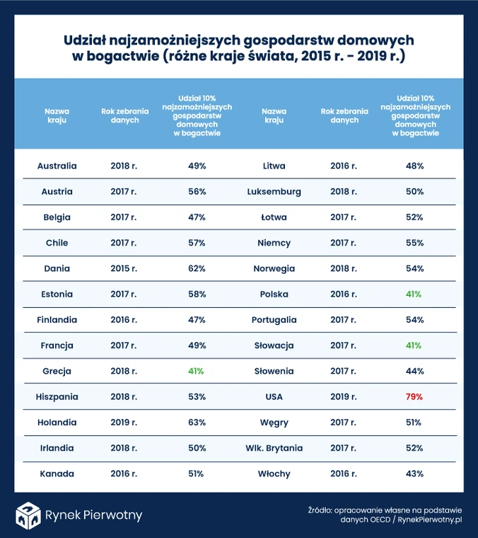 Gdyby ktoś próbował wziąć w obronę Amerykę, to zapewne mógłby podnosić, że mieszkańcy USA są bogatsi od Polaków. Ale popatrzmy na odsetek obywateli, który deklaruje posiadanie oszczędności. W grudniu 2019 r. portal gobankingrates.com podał, że 45 proc. Amerykanów nie ma żadnych zaskórniaków. Jak to wygląda w Polsce? Otóż paradoksalnie lepiej.  Tylko 24 proc. z nas nie ma żadnych odłożonych pieniędzy (dane z ankiety przeprowadzonej na zlecenie Krajowego Rejestru Długów i opublikowanej w styczniu 2021 r.). A to prawie o połowę mniej niż w Stanach Zjednoczonych.