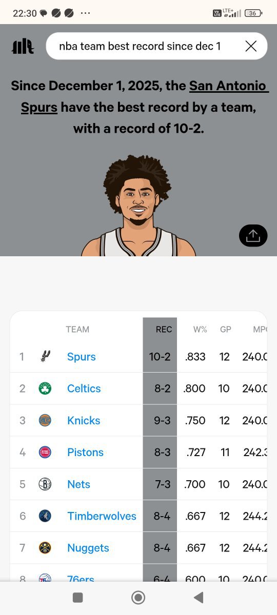 Ale nie zmienia to faktu ,ze w grudniu gra rewelacyjnie. 27 pkt przy 7 trójkach z 43% skutecznością  8,5 rzutów z lini z 91% skutecznością.  Po prostu ciężko sie tankuje kiedy Lauri caly sezon gra jak All star a teraz dochodzi ci młodziak który nie pęka w zaciętych końcówkach