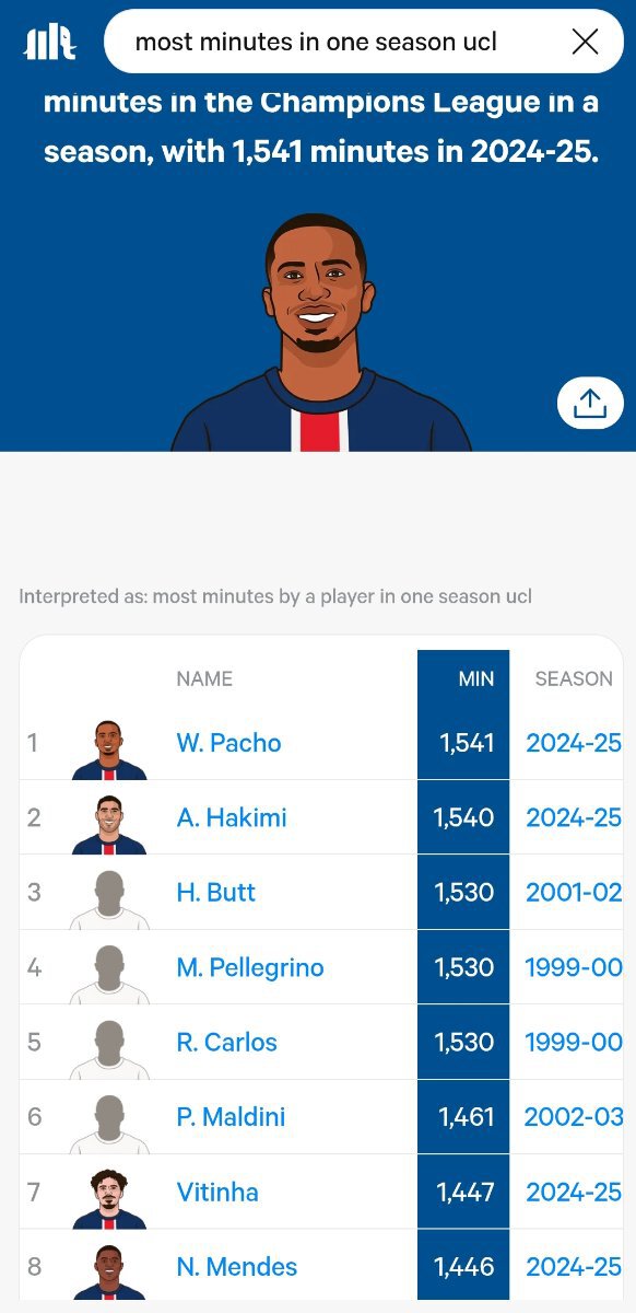 Hakimi 24/25 -   statystki ofensywne Achrafa mogą niejednego zmylić i sugerować, że to świetny skrzydłowy. Tymczasem 4G+5A to dorobek nominalnego prawego obrońcy. 7 meczy (na 17) na zero z tyłu niby takie se, ale ważne za to w których meczach. O ile w fazie ligowej PSG prezentował dosyć radosną twórczość defensywną, to w fazie pucharowej (i przede wszystkim w samym finale) aż pięciokrotnie zagrali na zero z tyłu. Kolejna jego zasługa to napoczęcie Interu w finale.